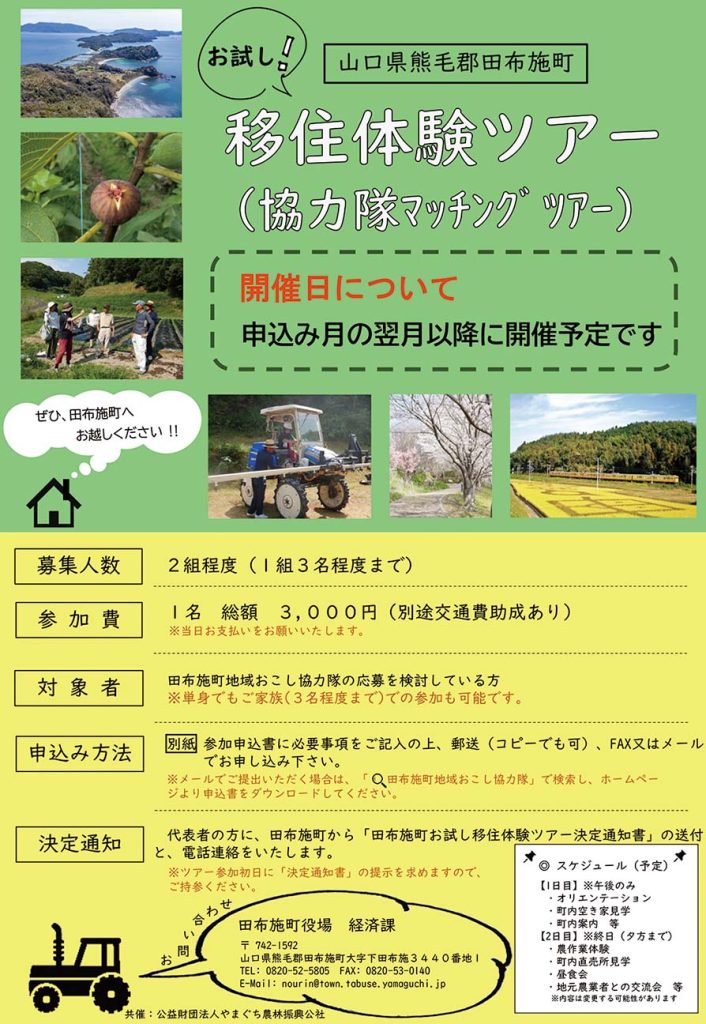 決定通知 | 代表者の方に、田布施町から「田布施町お試し移住体験ツアー決定通知書」の送付と、電話連絡をいたします。 |