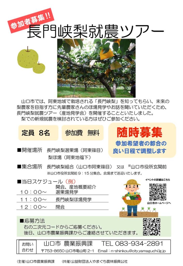 | その他 | 詳しくは「長門峡梨就農ツアー(産地見学会)の参加者を募集します(山口市)」をご確認ください。 |