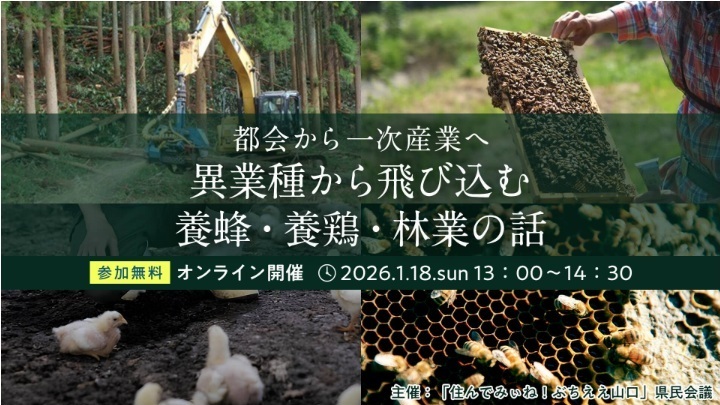 | 概要 | 今回は、一次産業に興味のある方を対象に、異業種から養蜂・養鶏・林業という一次産業へ転身した3人のゲストをお迎えし、リアルな体験談をお話しいただきます。 また、 山口県が提供する農林業の研修制度やサポート体制についても、これから始めたい方の視点でわかりやすくご紹介します。 詳細は「住んでみいね!ぶちええ山口」をご確認ください。 |