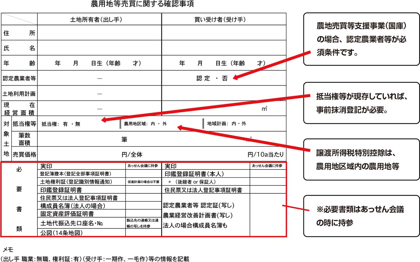 農業委員会が農業者(売主、買主)から相談を受け、農業委員会あっせんによる機構活用の売買を計画される場合、農業委員会は下表の「農用地等売買に関する確認事項(農地売買等事務に係る事務処理要領の様式1)」を確認、調整しながら、機構へ連絡し、機構とともに売買事業実施の準備を進めていくこととなります。